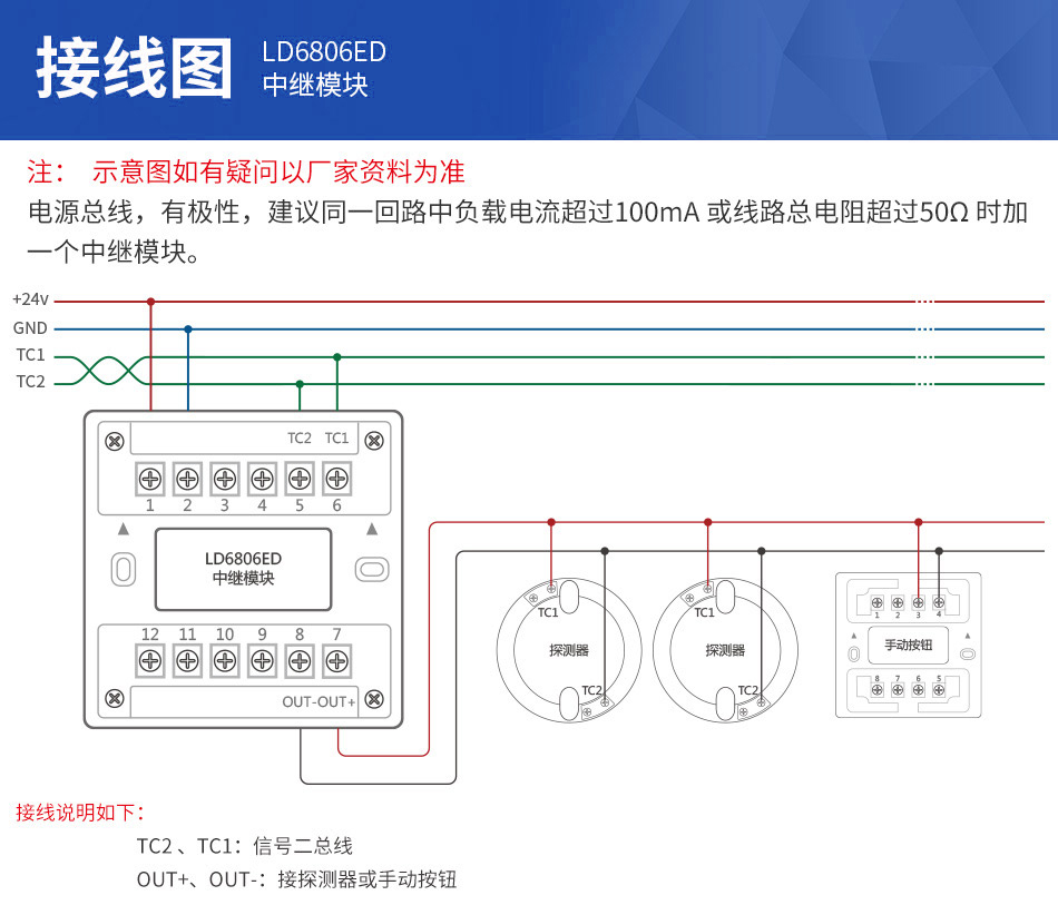 3、建議同一回路中負(fù)載電流超過(guò)100mA或線路總電阻超過(guò)50Ω時(shí)加一個(gè)中繼模塊。