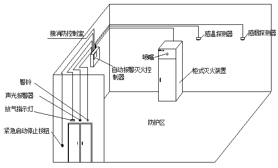 當(dāng)兩種探測器發(fā)出火災(zāi)信號時(shí),控制主機(jī)啟動(dòng)警鈴和聲光報(bào)警器,聯(lián)動(dòng)關(guān)閉防護(hù)區(qū)開口,進(jìn)入滅火啟動(dòng)延時(shí),達(dá)到設(shè)定的延時(shí)時(shí)間后,自動(dòng)啟動(dòng)滅火裝置。