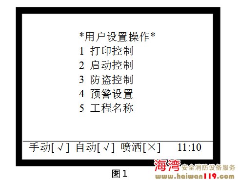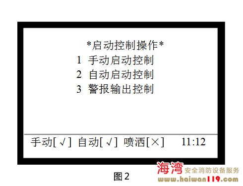 啟動(dòng)控制設(shè)置 在圖1所示界面下,按2進(jìn)入“啟動(dòng)控制”界面,調(diào)出啟動(dòng)控制操作菜單,如圖2所示,包含手動(dòng)啟動(dòng)控制、自動(dòng)啟動(dòng)控制、警報(bào)輸出控制的設(shè)置,可通過(guò)按下其對(duì)應(yīng)的數(shù)字鍵進(jìn)行相關(guān)的設(shè)置