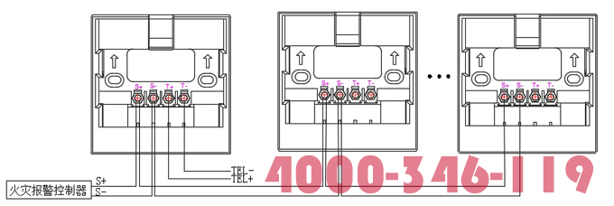 “S+”、“S-”為總線端子,接入火災(zāi)報(bào)警控制器;“T+”、“T-”為對講電話接線端子,可根據(jù)需要接入消防電話主機(jī)。