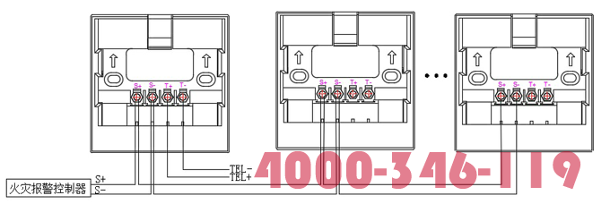 “S+”、“S-”為總線端子,接入火災(zāi)報警控制器;“T+”、“T-”為對講電話接線端子,可根據(jù)需要接入消防電話主機。