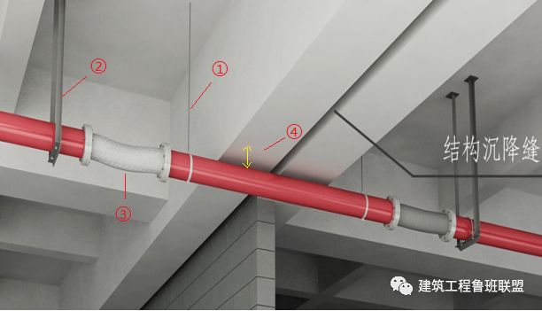 ①②:風管穿越變形縫一端(左)設置活動吊架,另外一端(右)設置風管固定吊架。