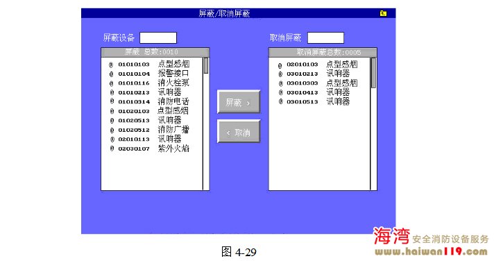 當(dāng)外部設(shè)備(探測器、模塊或火災(zāi)顯示盤)發(fā)生故障時,可將它屏蔽掉,待修理或更換后,再利用取消屏蔽功能將設(shè)備恢復(fù)。